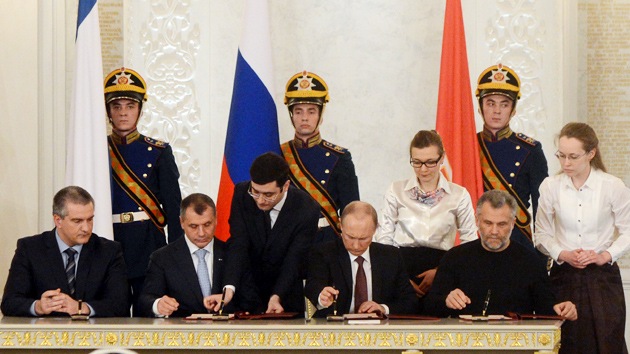 El día 11 de marzo, Crimea y la ciudad de Sebastopol declararon su independencia de Ucrania, previo restablecimiento de la constitución de 1992, ley fundamental que consideraba a la república como un territorio soberano con una ciudadanía y una policía propias, que delega voluntariamente competencias a Ucrania y tiene derecho a tomar sus propias decisiones y fija sus relaciones con Kiev con base en un tratado mutuo, proclamando la República de Crimea,r sólo por Rusia. El 18 de marzo, los líderes de la República de Crimea, Serguéi Aksiónov y Vladímir Konstantínov, el presidente de Rusia, Vladímir Putin, y el alcalde de Sebastopol, Anatolia Chali, firmaron el tratado de adhesión de dos nuevos territorios federales a Rusia.